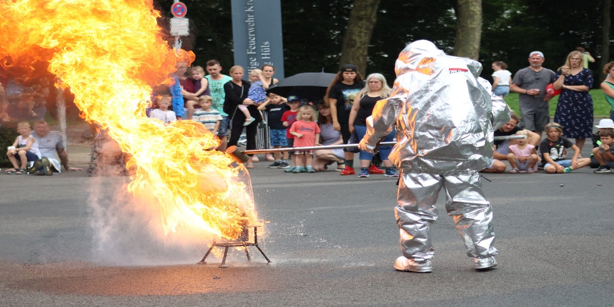 Am Samstag (19.08.2023) lud der Löschzug Hüls der Freiwilligen Feuerwehr Krefeld zum Tag der offenen Tür ein. Trotz eines sehr durchwachsenen Wetters strömten kleine und große Gäste auf das Gelände des Löschzuges am „Den Ham“ in Krefeld-Hüls. Neben dem Löschzug präsentierte sich auch die Bereitschaft Hüls des Deutschen Roten Kreuzes, die Rettungshundestaffel des Deutschen Roten Kreuzes und die Aktion Traumfänger. Die Gäste konnten sich an einer Hüpfburg, an Wasserspielen, an einem kleinen Karussell, an einer Fahrzeugausstellung, an Führungen durch das Gerätehaus und an Rundfahrten im Löschfahrzeug erfreuen. Für das leibliche wohl sorgten die Kameraden mittels leckeren vom Grill, süßen Leckereien und Erfrischungsgetränken. Des Weiteren präsentierten die Kameraden im laufe des Tages verschiedene Übungen und Szenarien vor dem Gerätehaus. Ganz Besonders staunten die kleinen Gäste bei der Technischen Hilfeleistung nach einem Verkehrsunfall und bei der Explosion einer Deo- oder Haarspraydose bei Hitzeeinwirkung.