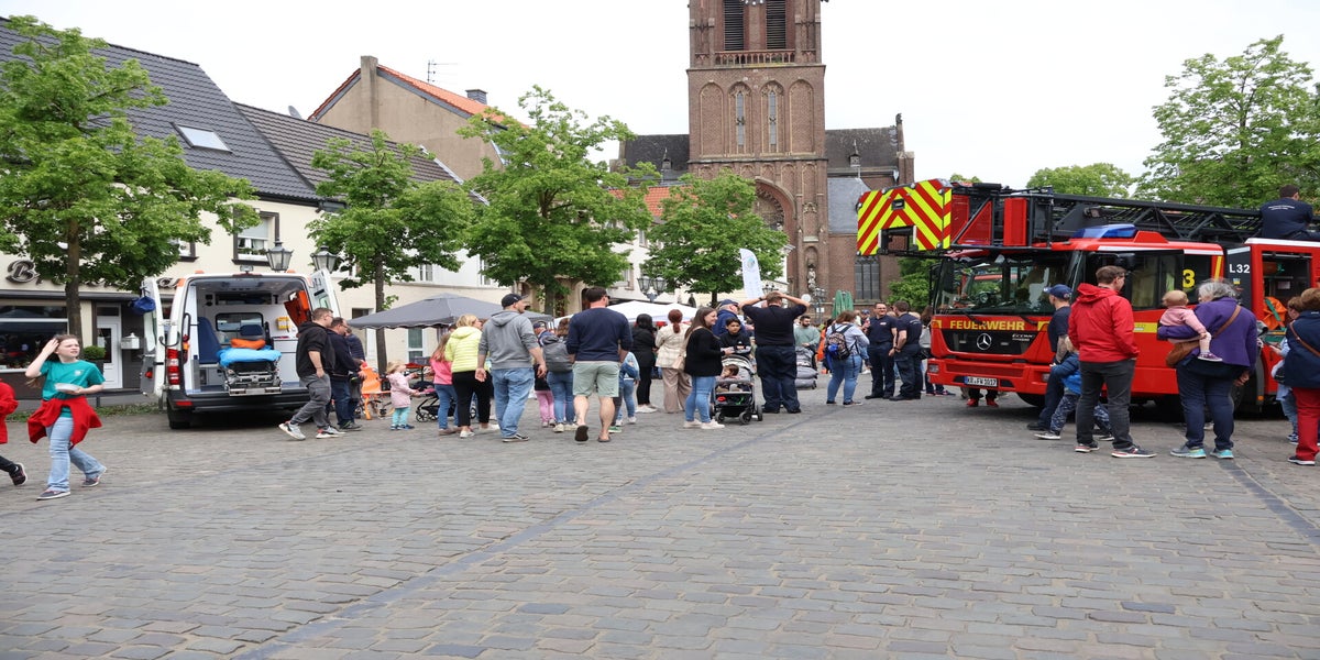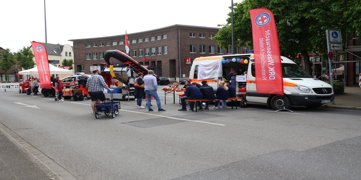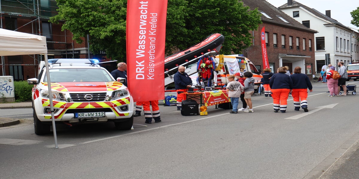 Einsatzkräfte der DLRG , der Wasserwacht, der DRK Bereitschaft Hüls, des JRK , der Freiwilligen Feuerwehr Hüls und der Bezirksdienst der Polizei Krefeld-Hüls präsentierten sich auf dem Hülser Marktplatz und auf der Tönisberger Str.