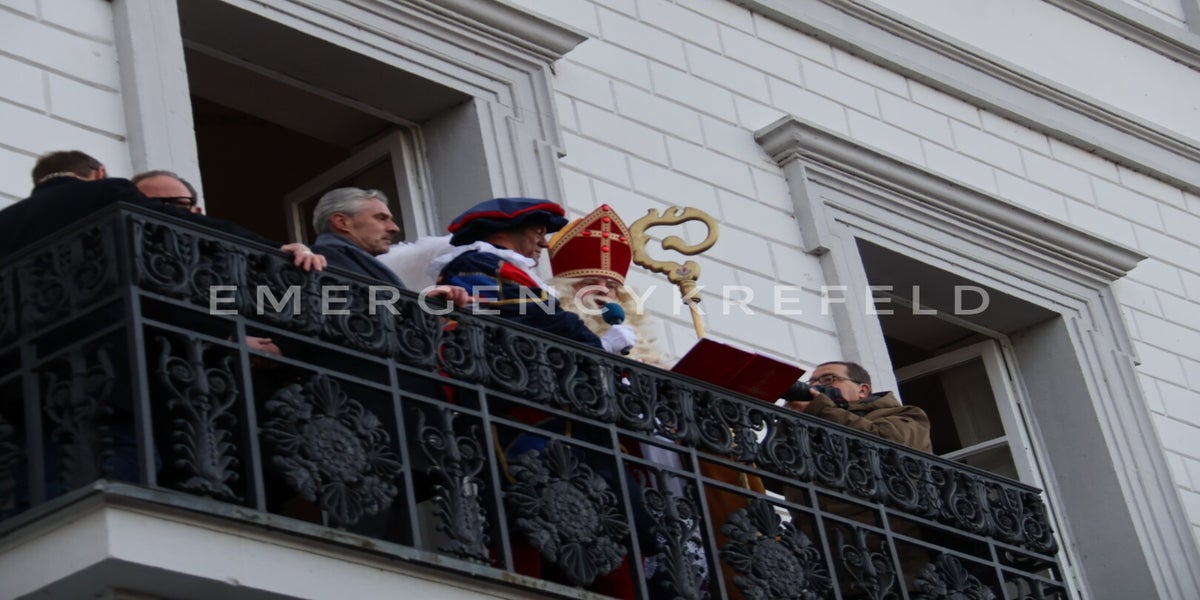 Anschließend ging es für Sinter Klaas, mit musikalischer Begleitung, einmal durch die Uerdinger Fußgängerzone bis hin zum Rathaus. Vom Rathausbalkon aus richtete Sinter Klaas einige Worte an die Besucher vor dem Rathaus und auf dem historischen Marktplatz.